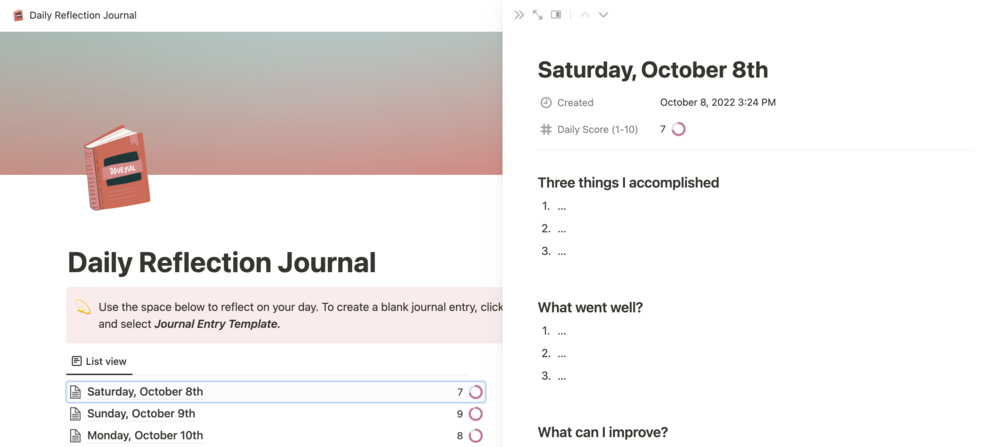 A simple way to reflect on your day, this Notion template makes it easy to review what happened, how you can improve, and what you're grateful for.