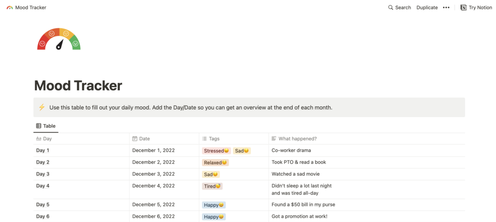 A Mood Tracker Notion Template that you can duplicate. Includes a master table, notable moments list, and an overview trend calendar.